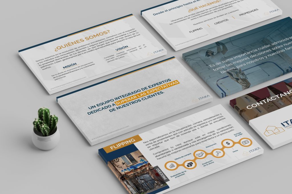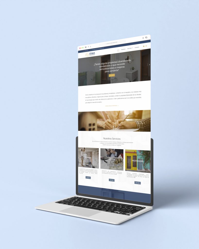 Itaka es una empresa experta en la resolución de problemas inmobiliarios, la cual cuenta con el respaldo y los métodos más innovadores, eficientes y seguros para comprar, remodelar y vender propiedades liberándo a sus clientes de sus deudas, sin tener que invertir más dinero de su patrimonio. Trabajamos con Itaka desde la sesión de posicionamiento estratégico hasta el desarrollo de elementos visuales funcionales para su mercado.